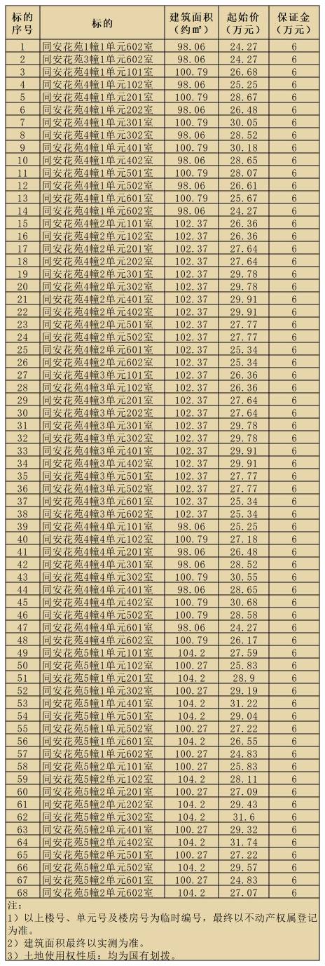 一、 拍卖标的基本情况及起始价:平阳县萧江镇同安花苑多层富余68套住宅用房合计起始价为1883.35万元,标的具体情况见附表。竞买人交纳一份竞买保证金可参加相同保证金各标的的竞买活动,但一份保证金只能竞得一个标的,如竞买人欲竞得多个标的,则必须交纳与竞得标的相同份数的保证金。